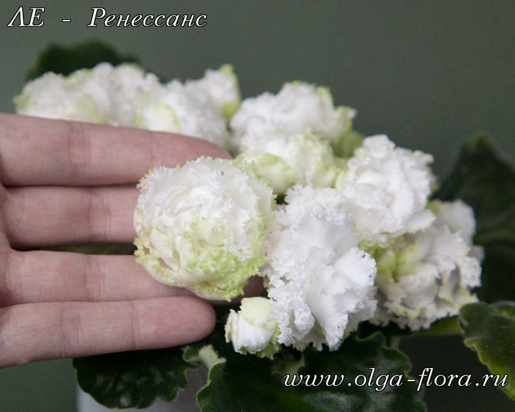 | Фиалки ЛЕ - Ренессанс (Лебецкая) Белые махровые крупные звезды-помпоны с зеленой рюшкой. Обильнейшее цветение. Изумрудные слегка волнистые листья. Лист свежесрезанный: 100 руб. | |