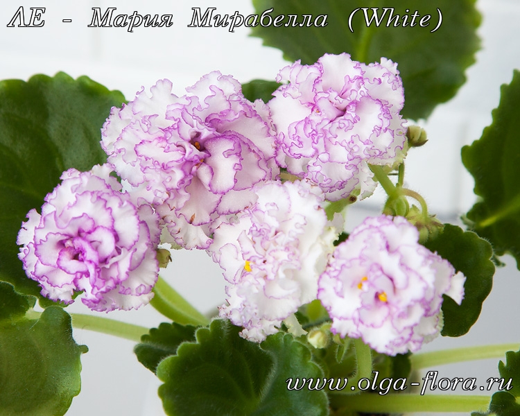 | Фиалки ЛЕ - Мария Мирабелла (White) (Лебецкая) Белые махровые звезды помпоны с тонким обрамлением малинового цвета на гофрированной кайме. Ровная аккуратная средне-зеленая розетка. Я специально покупала именно светлый вариант этого сорта (спорт), т.к. он интересней самого сорта. Лист свежесрезанный: 100 руб. | |