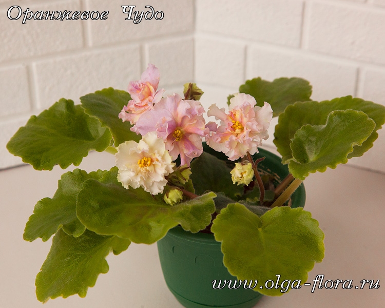 Оранжевое Чудо (Н. Хорошилова) Махровые цветы с густыми жёлтыми мазками и розовыми бликами, получается необычная оранжевая серединка. Светло-зелёная волнистая листва с красными черешками листьев (спорт от Sunkissed Rose). Лист свежесрезанный: 100 руб. | |