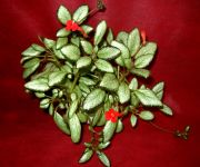 Ярко-красные цветы с жёлтым горлышком. Крупные блестящие гладкие серебристые листья с коричнево-оливковым кантом.